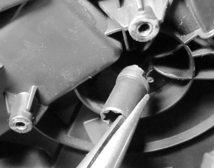 21. Inspect the temperature door shaft. If the end of the shaft is still firmly attached to the door, break the shaft with pliers using a back and forth motion. Remove the end of the shaft from the HVAC module and discard.