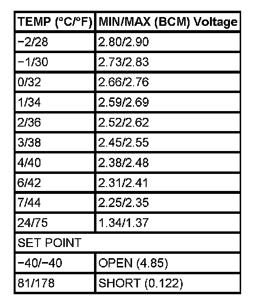 The refrigerant temperature at the temperature sensor in the thermal expansion valve (TXV) controls cycling of the compressor clutch to prevent freezing of the evaporator core. The compressor is disabled when the temperature goes below 3°C (37°F) and vehicle speed is greater than 8 km/h (5 mph). The compressor is enabled when the temperature exceeds 4°C (40°F). The minimum cycling time off is 4 seconds. For purposes of converting a voltage to a temperature value in the diagnosis of the temperature sensor located within the TXV at the inlet outlet of the evaporator the conversion chart has been inputted. The evaporator temperature sensor is an input to the body control module (BCM).
