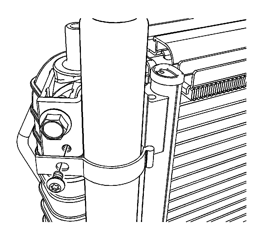 3. Remove the bolt retaining the receiver dehydrator mounting clamp to the condenser.