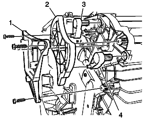 5. Remove the mode cam bracket (1), mode cam (2) and the mode cam levers (3 and 4). Refer to the illustration above and the Mode Cam Replacement procedure in SI.