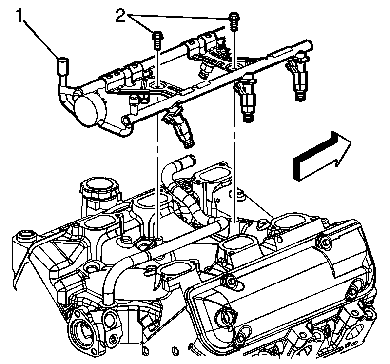 4. Press on the fuel rail (1) using the palms of both hands until the fuel injectors are fully seated.