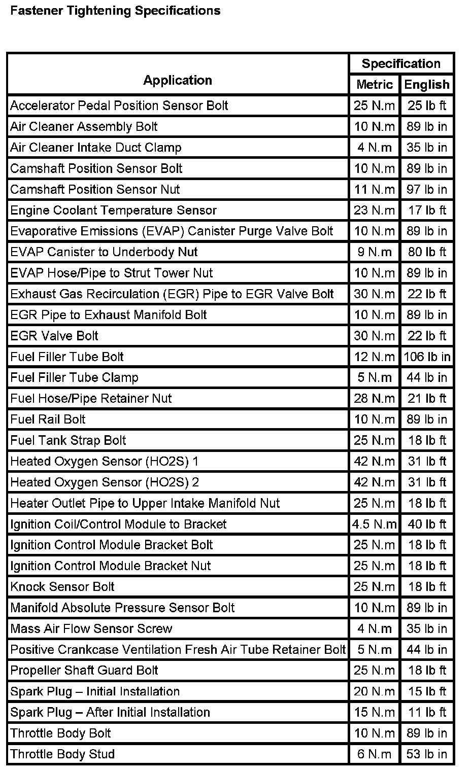 Fastener Tightening Specifications: