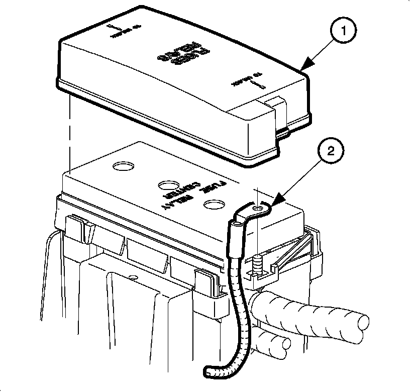 13. Install the positive battery cable and electronic power steering (EPS) wire (2) to the B+ terminal at UHFB.