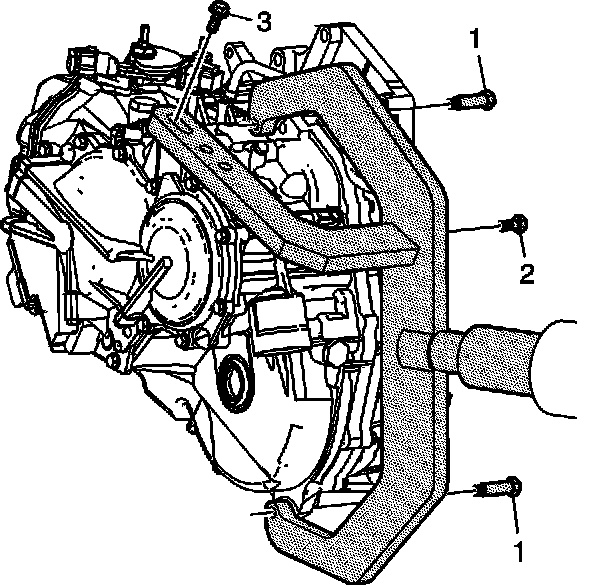 1. Install the body of the J 45159 with the two long bolts (1) to the transaxle.