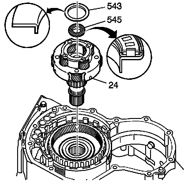 3. Install the front sun gear thrust bearing (545) and the front sun gear thrust bearing race (543).