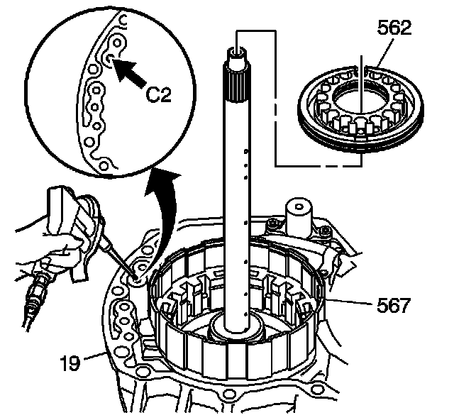 10. While pulling on the piston by hand, apply compressed air into the fluid passage (C2) in order to remove the direct clutch piston (562).