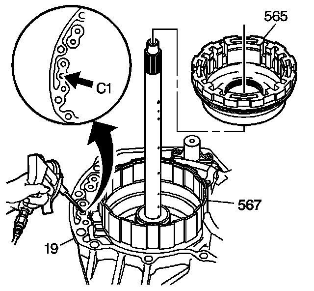 12. While pulling upward on the piston by hand, apply compressed air into the fluid passage (C1) in order to remove the forward clutch piston (565).