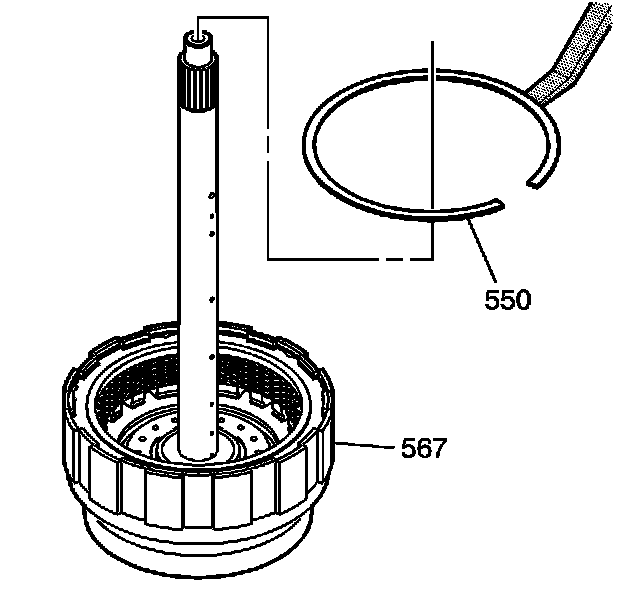 27. Install the forward clutch backing plate retaining ring (550) into the groove in the forward and direct clutch housing assembly - with input shaft (567) using J 28585.