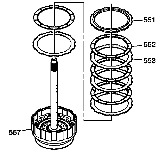 25. Install the 4 forward clutch steel plates (553) and the 4 forward clutch fiber plates (552).