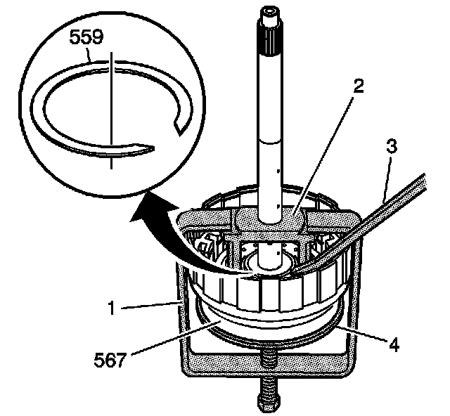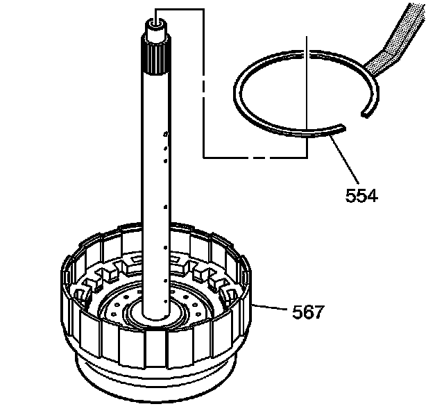 24. Install the direct clutch backing plate retaining ring (554) into the groove in the forward and direct clutch housing assembly - with input shaft (567) using J 28585.