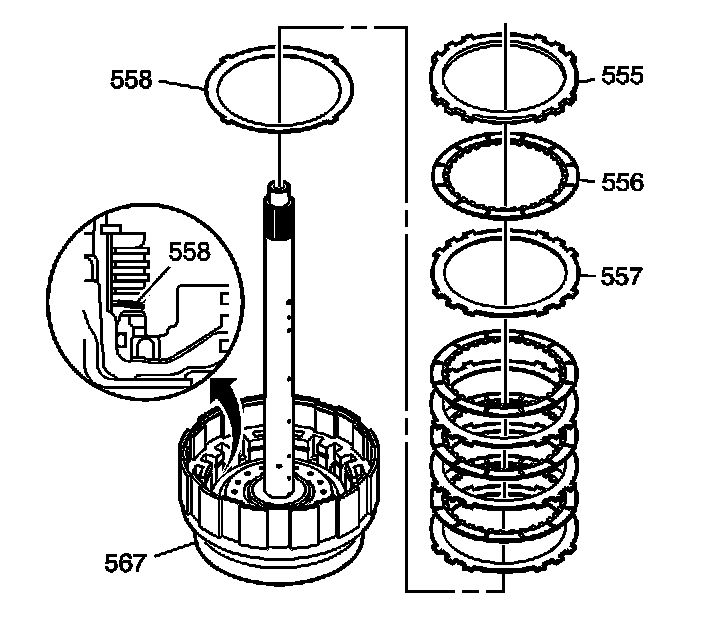 21. Install the direct clutch apply plate (558). The plate is convex shaped.