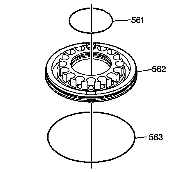 16. Install the direct clutch piston inner seal (561) and the direct clutch piston outer seal (563) onto the direct clutch piston (562).