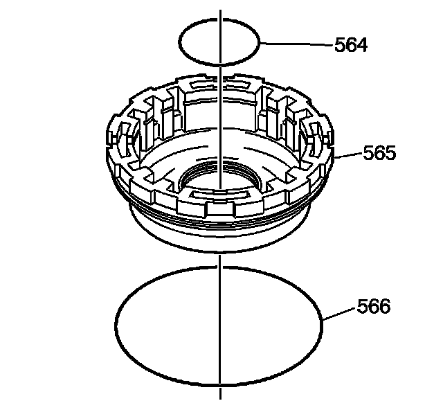 11. Install the forward clutch piston inner seal (564) and the forward clutch piston outer seal (566) onto the forward clutch piston (565).