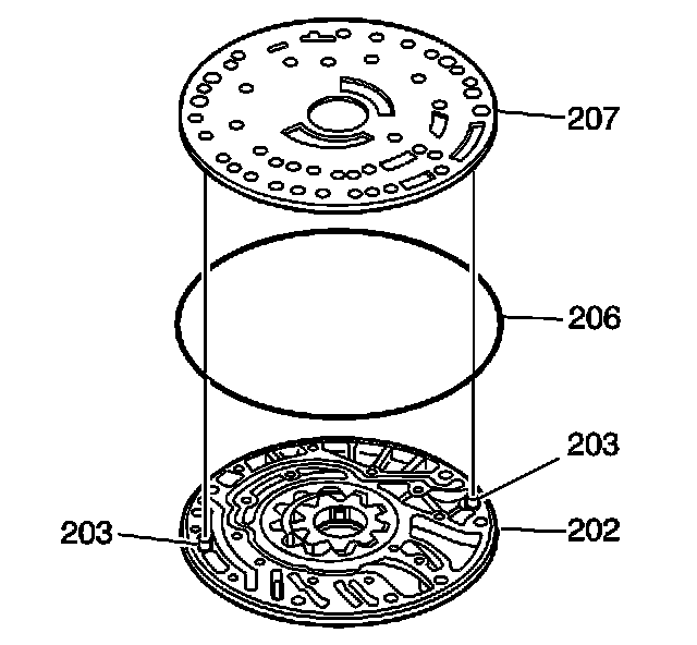 7. Align the fluid pump plate (207) holes with the alignment pins (203) in the fluid pump body (202).