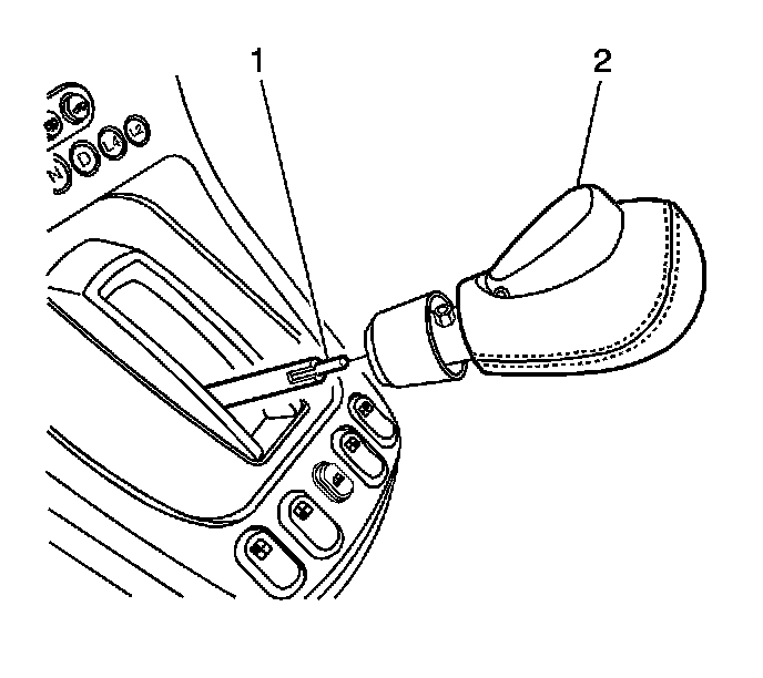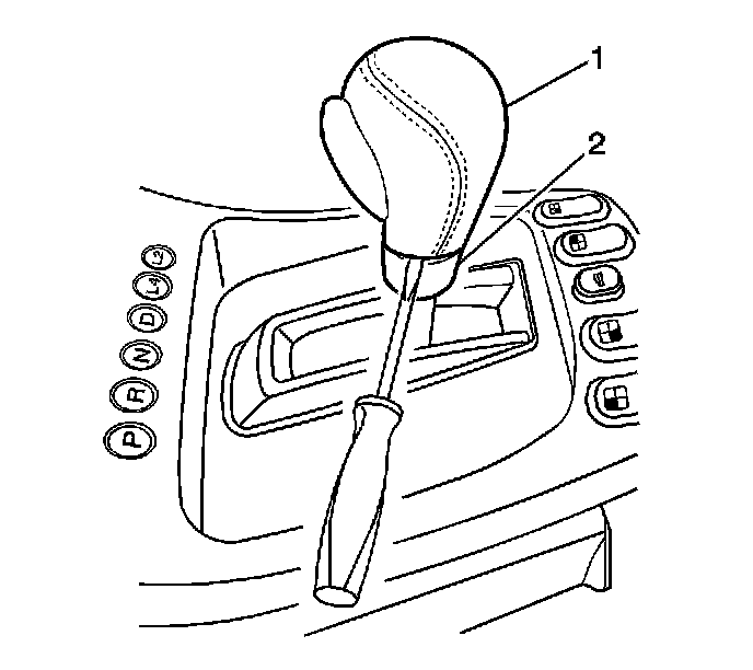 4. Carefully insert a small flat bladed tool between the trim ring (2) and the shift knob (1). Apply careful downward pressure to the shift knob trim ring to separate the trim ring from the shift knob. The trim ring will drop down approximately 13.0 mm (0.5 inch) exposing the shift knob retaining screw.