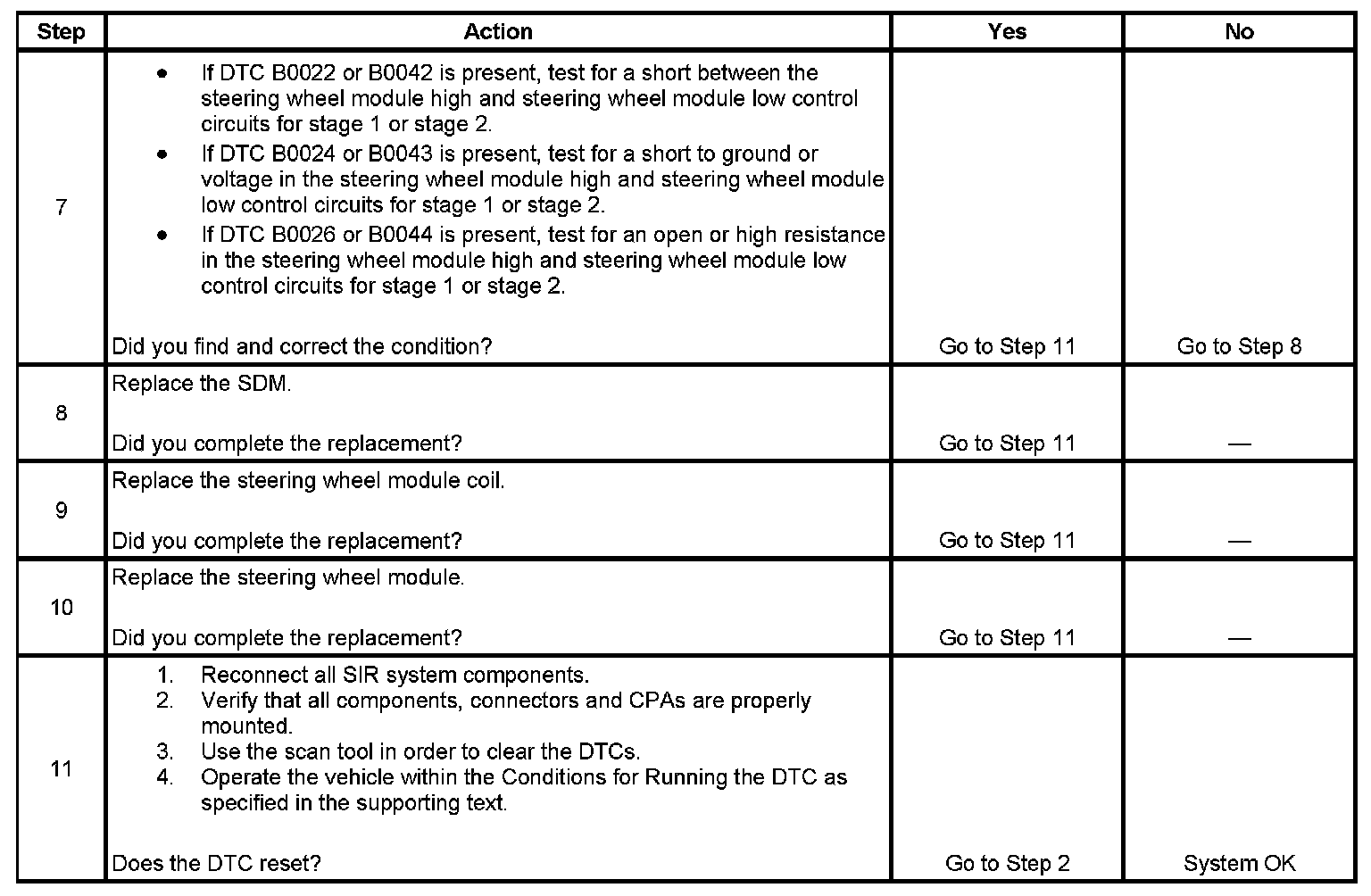 7. This step tests for current DTCs. If DTC B0022 or B0042 is present, test for a short between the steering wheel module high and steering wheel module low control circuits for stage 1 or stage 2. If DTC B0024 or B0043 is present, test for a short to ground or voltage in the steering wheel module high and steering wheel module low control circuits for stage 1 or stage 2. If DTC B0026 or B0044 is present, test for an open or high resistance in the steering wheel module high and steering wheel module low control circuits for stage 1 or stage 2.