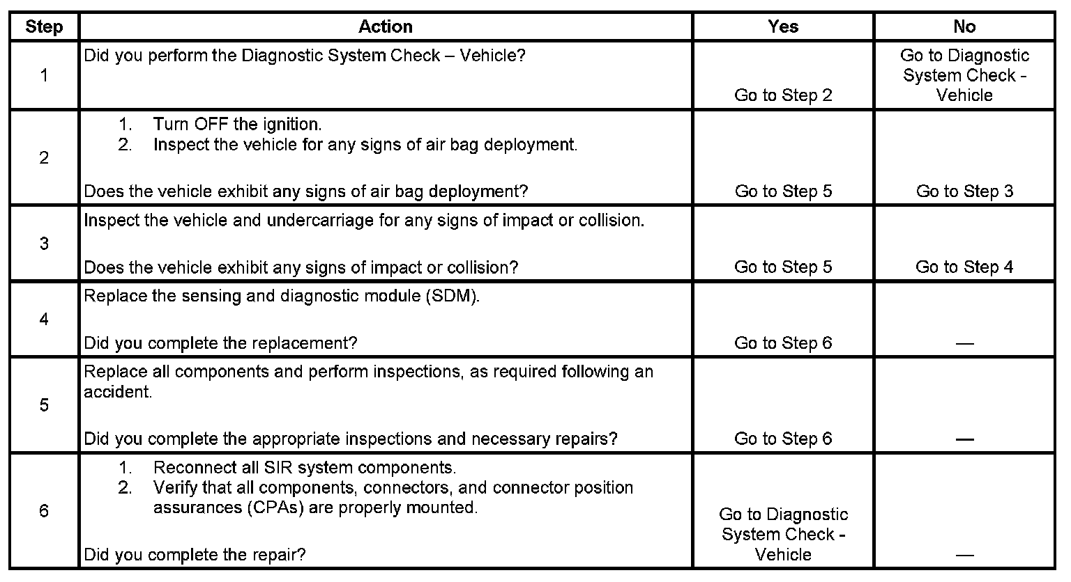 The inflatable restraint sensing and diagnostic module (SDM) contains a sensing device that converts changes in vehicle velocity to an electrical signal. The SDM compares this signal to a value stored in memory. When the generated signal exceeds the stored value, the SDM performs additional signal processing and compares the generated signals to values stored in memory. When 2 of the generated signals exceed the stored values, the SDM will cause current to flow through the inflator modules, deploying the air bags and causing DTC B0051 to set.