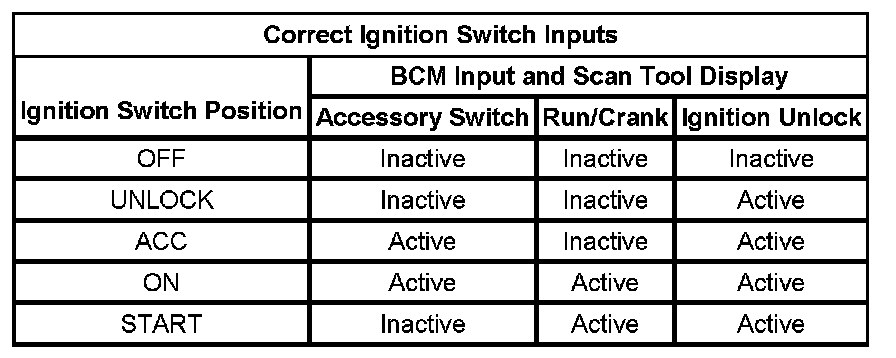 The body control module (BCM) is the power mode master responsible for sending ignition switch position information on the class 2 serial data link. The BCM monitors 3 discrete wires from the ignition switch contacts and the engine run flag (ERF) in order to determine the present power mode. The BCM communicates this power mode information to all class 2 modules on the class 2 serial data link. The table represents correct BCM power mode data.