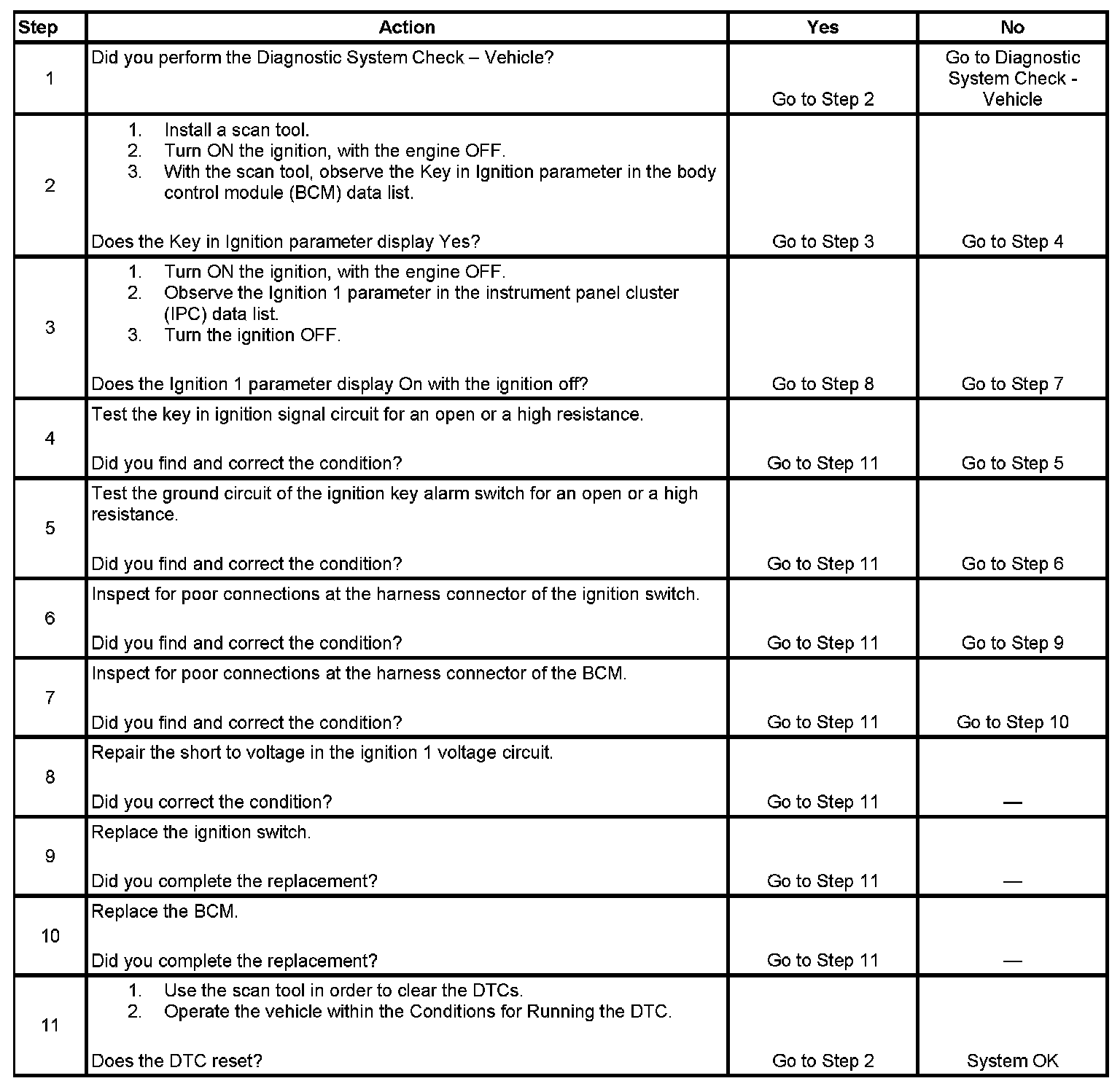 - The ignition 1 input is active and the key in ignition switch signal circuit is inactive and the signal circuit is high.