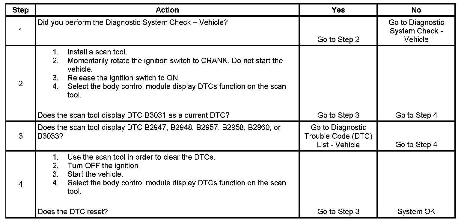 3. This step tests for the proper operation of the 12-volt reference security sensor power circuit, sensor ground circuit, and Passlock(TM) sensor signal data circuit. Troubleshoot the appropriate DTC prior to diagnosing DTC B3031.
