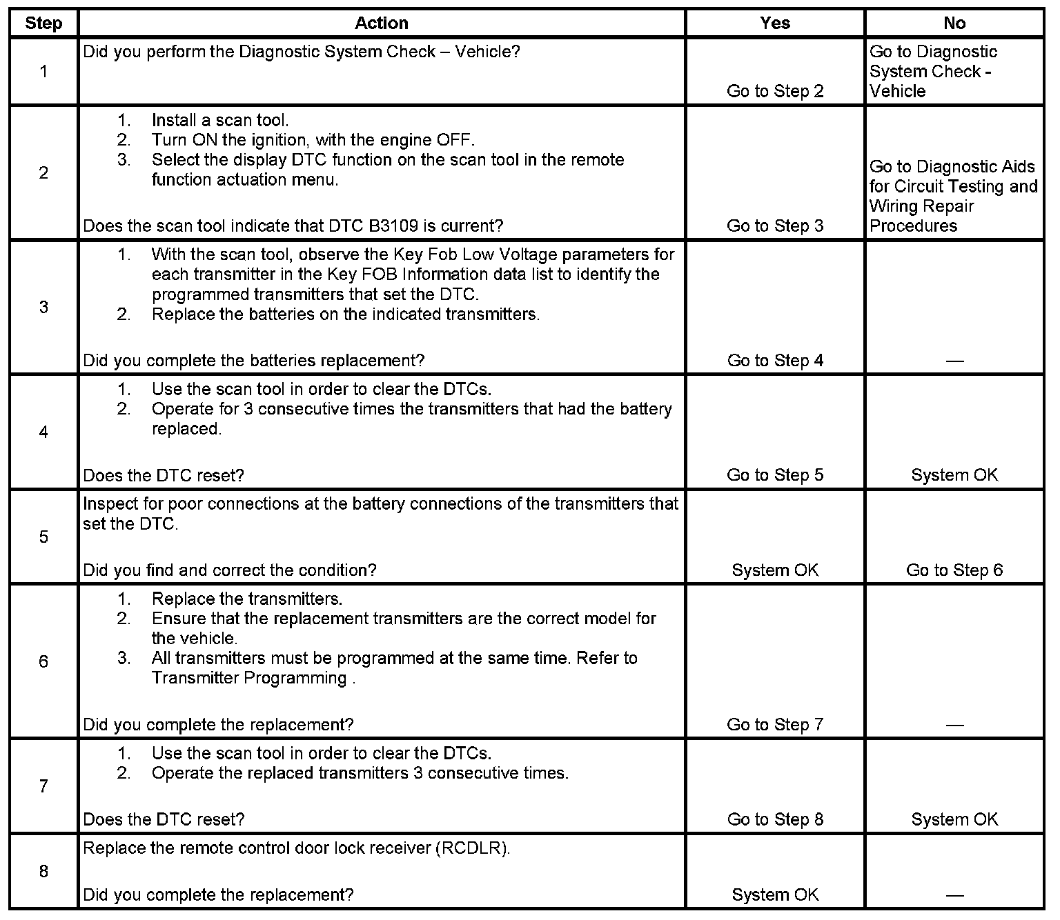 The numbers below refer to the step numbers on the diagnostic table.