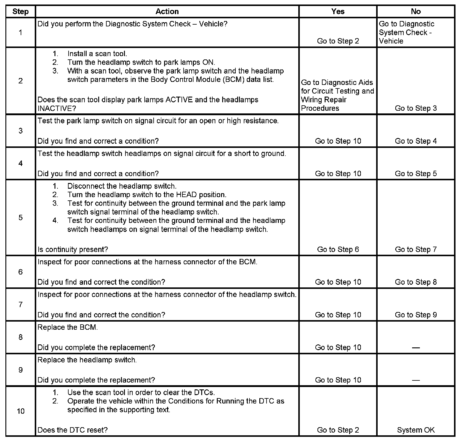 The body control module (BCM) monitors the park lamp switch on signal circuit and the headlamp switch headlamps on signal circuit in order to determine when the park lamps and headlamps should be illuminated. When the headlamp switch is turned to PARK, the BCM senses that the park lamp switch signal on circuit is grounded and the headlamps switch headlamps ON signal circuit is open. The BCM will then energize the park lamp relay illuminating the park lamps. When the headlamp switch is turned to HEAD, the BCM senses that the park lamp switch on signal circuit and the headlamp switch headlamps ON signal circuit are grounded. The BCM will then energize the park lamp relay and headlamp low beam relay or high beam relay illuminating the park lamps and headlamps.