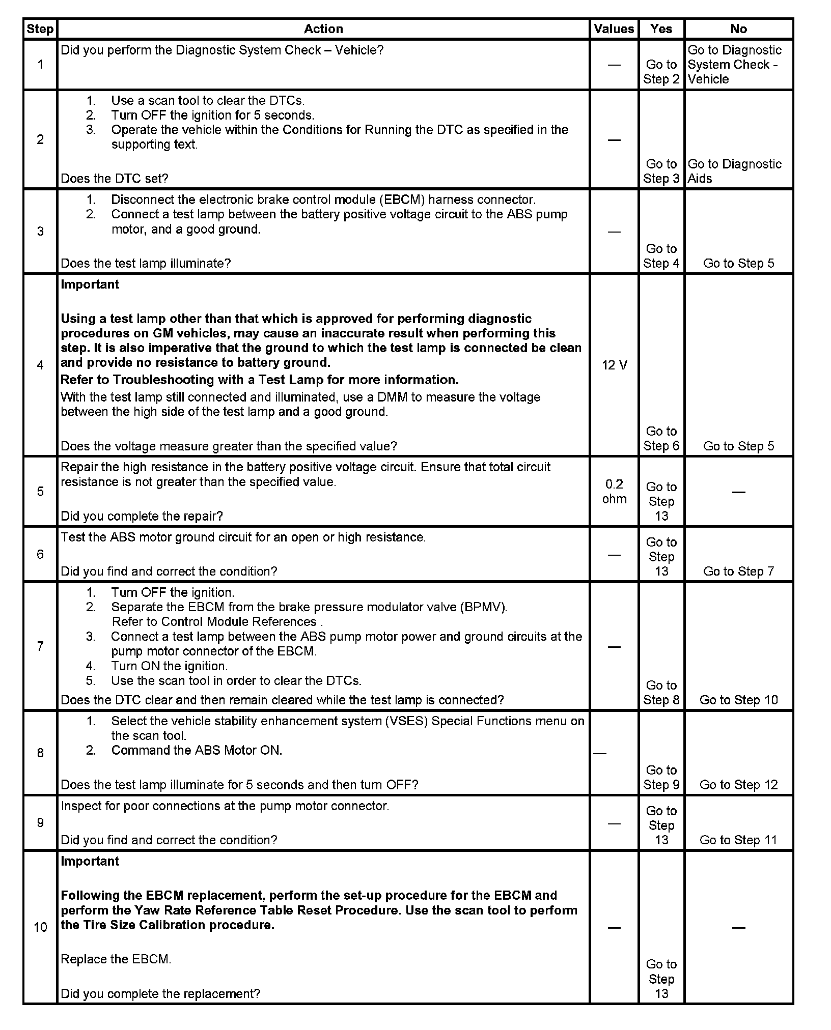 The EBCM detects an open pump motor circuit, a shorted pump motor, or a seized pump motor or ABS pump.