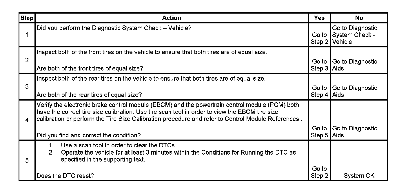 Installing one tire of significantly different size on the vehicle causes this DTC to set. Operating the vehicle with a tire that has very low air pressure may also set this DTC. Inspect the vehicle for an incorrect or damaged wheel speed sensor or VSS if the tires and the EBCM and PCM calibrations are OK.