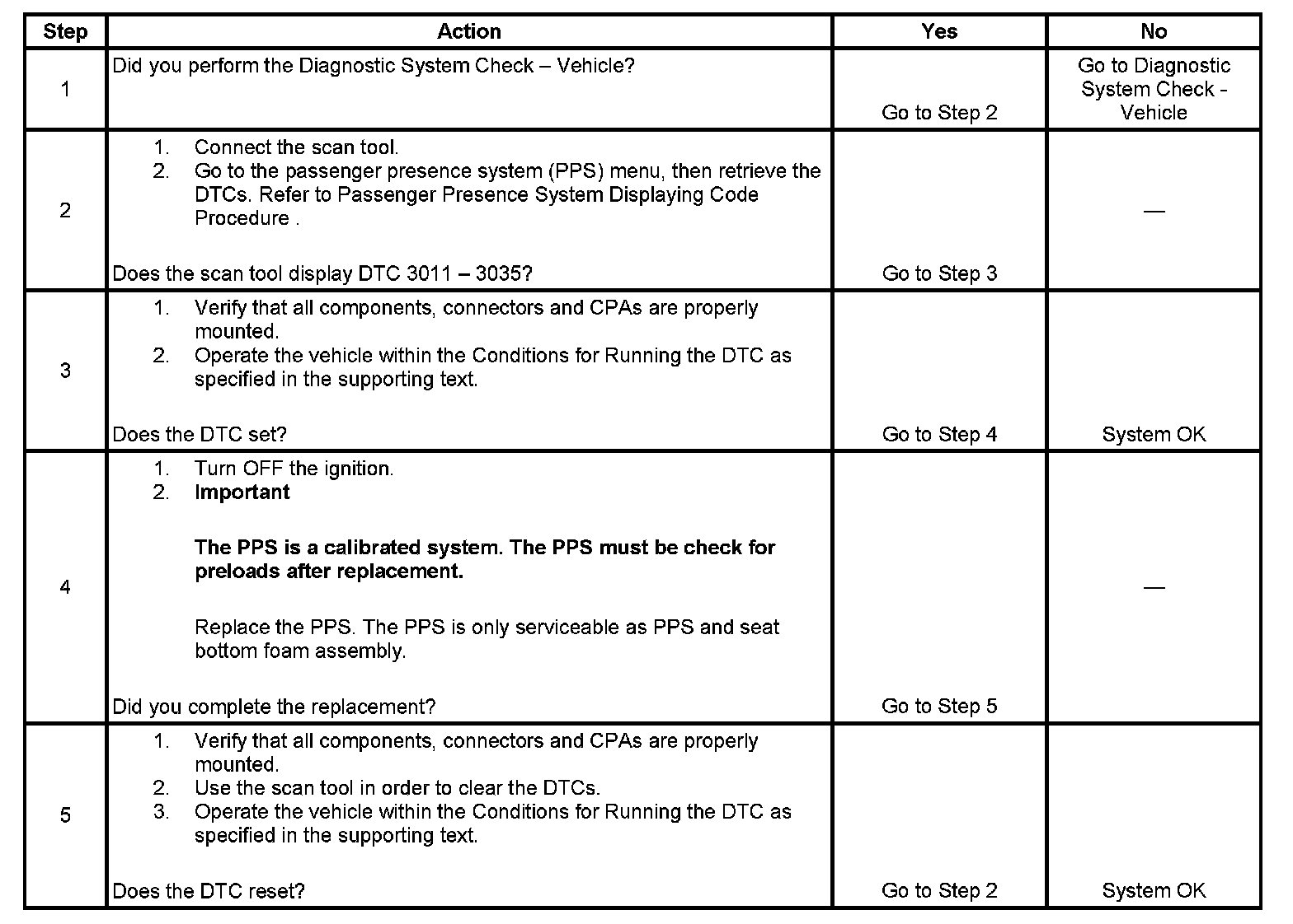 The inflatable restraint passenger presence system (PPS) is used to monitor the pressure profile of any occupant that is sitting in the front outboard passenger seat and communicate the profile classification to the sensing and diagnostic module (SDM). The SDM will either enable or suppress the deployment of the instrument panel (I/P) module based on the profile classification of the occupant. If the PPS detects this DTC within the PPS, then the PPS will communicate to the SDM through a non class 2 communications circuit that a PPS fault is present. The SDM will then set DTC B0092 indicating a problem within the PPS.