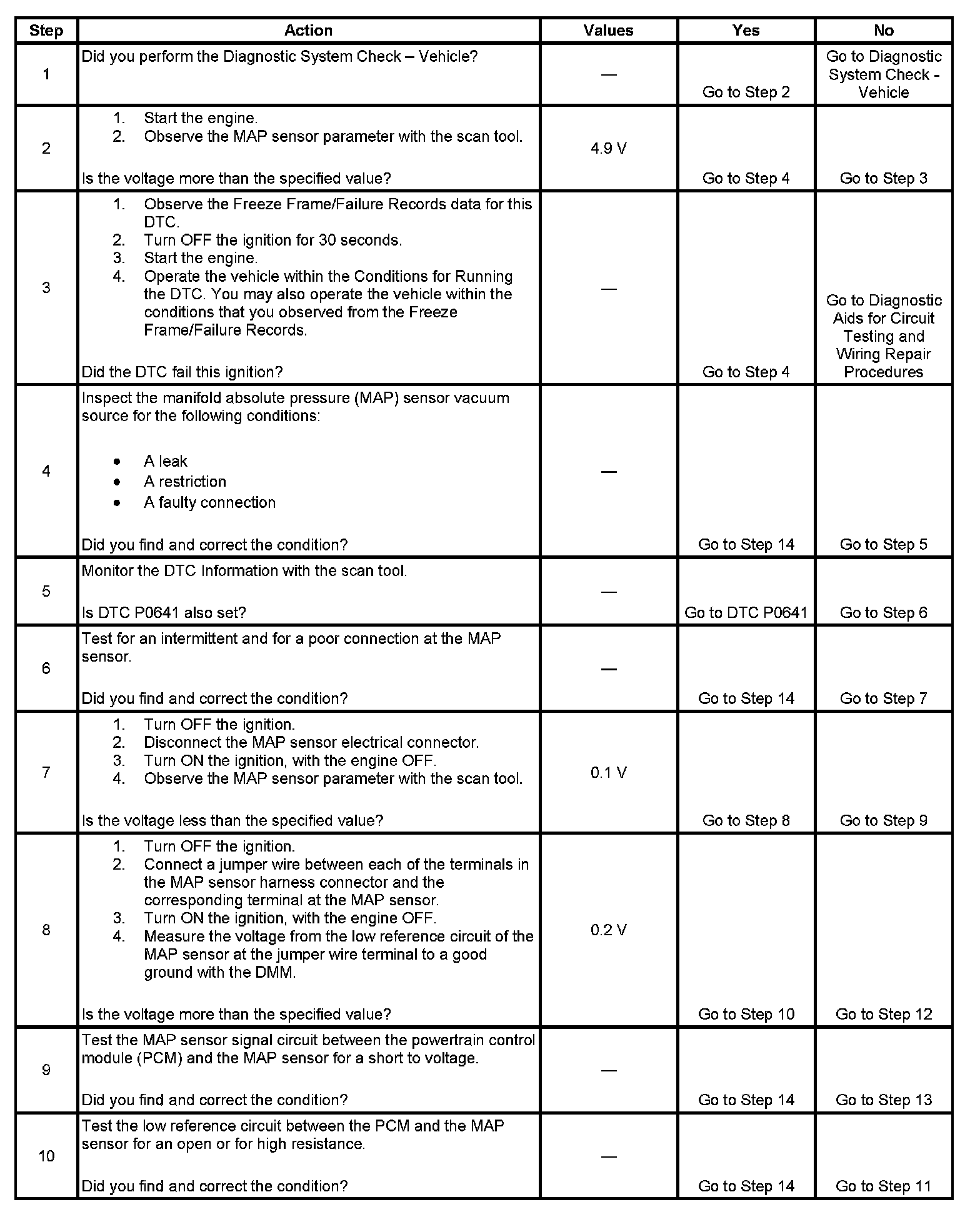 The powertrain control module (PCM) supplies 5 volts to the MAP sensor on the 5-Volt reference circuit. The PCM also provides a ground on the low reference circuit. The MAP sensor provides a signal to the PCM on the MAP sensor signal circuit which is relative to the pressure changes in the manifold. The PCM should detect a low signal voltage at a low MAP, such as during an idle or a deceleration. The PCM should detect a high signal voltage at a high MAP, such as the ignition is ON, with the engine OFF, or at a wide open throttle (WOT). The MAP sensor is also used in order to determine the barometric pressure (BARO). This occurs when the ignition switch is turned ON, with the engine OFF. The BARO reading may also be updated whenever the engine is operated at WOT. The PCM monitors the MAP sensor signal for voltage outside of the normal range.