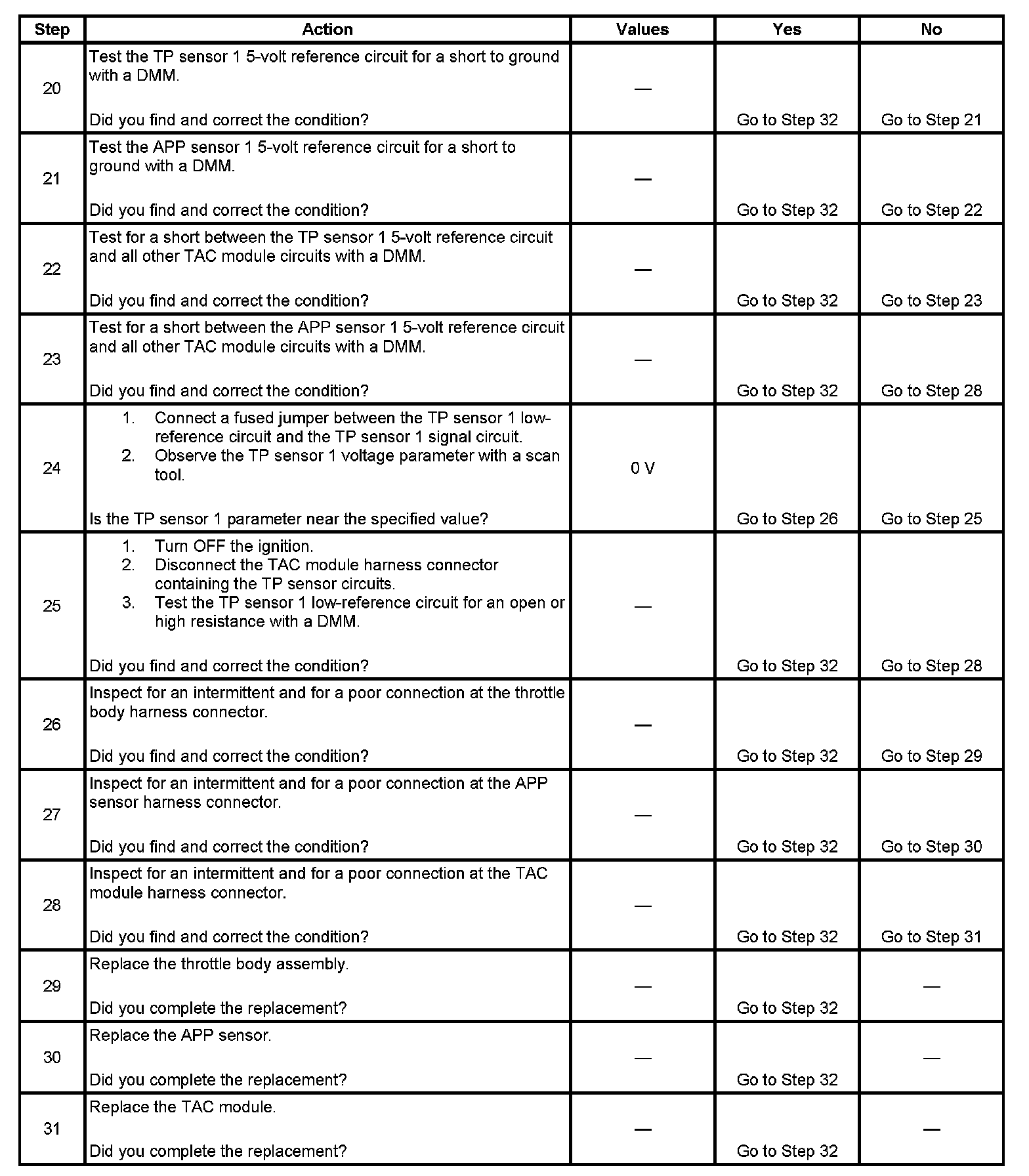 The throttle position (TP) sensor incorporates 2 ratiometric TP sensors into one housing. TP sensor 1 and TP sensor 2 each have a 5-Volt reference circuit supplied by the throttle actuator control (TAC) module. The TAC module supplies each TP sensor with a low reference circuit. Each TP sensor supplies the TAC module with a signal voltage that is proportional to the throttle blade position. Both of the TP signal voltages increase as the throttle blade is opened. The TP sensor 1 and the accelerator pedal position (APP) sensor 1 share a 5-Volt reference circuit that is bussed within the TAC module. The TP sensor 2 and the APP sensor 2 share a 5-Volt reference circuit that is also bussed within the TAC module. When this DTC sets, the Reduced Engine Power indicator will be displayed.