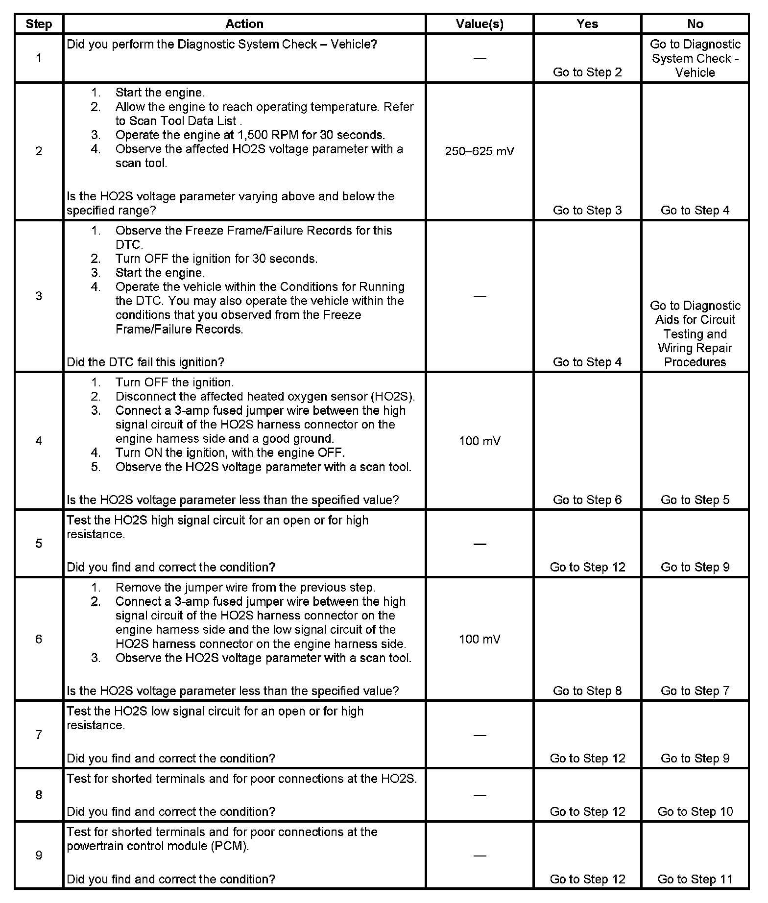 Heated oxygen sensors (HO2S) are used for fuel control and post catalyst monitoring. Each HO2S compares the oxygen content of the surrounding air with the oxygen content in the exhaust stream. The HO2S must reach operating temperature to provide an accurate voltage signal. Heating elements inside the HO2S minimize the time required for the sensors to reach operating temperature. The powertrain control module (PCM) supplies the HO2S with a reference, or bias, voltage of about 450 mV. When the engine is first started the PCM operates in open loop, ignoring the HO2S voltage signal. Once the HO2S reaches operating temperature and closed loop is achieved, the HO2S generates a voltage within a range of 0-1,000 mV that fluctuates above and below bias voltage. High HO2S voltage indicates a rich exhaust stream; low HO2S voltage indicates a lean exhaust stream. This diagnostic will only run once per ignition cycle. The PCM monitors the rich-to-lean and lean-to-rich transition time. A transition is defined as, the HO2S voltage changes from greater than 625 mV to less than 250 mV or from less than 250 mV to greater than 625 mV. If the PCM detects that the transition time is too long, DTC P0133 sets for HO2S bank 1 sensor 1, or DTC P0153 sets for HO2S bank 2 sensor 1.