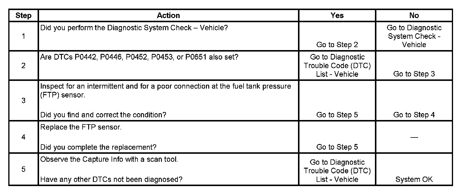 The fuel tank pressure (FTP) sensor measures air pressure or vacuum in the evaporative emission (EVAP) system. The control module supplies a 5-Volt reference and a low reference circuit to the FTP sensor. The FTP sensor signal voltage varies depending on EVAP system pressure or vacuum. The controller uses this FTP signal to determine atmospheric pressure for use in the engine OFF small leak test, P0442. This DTC will set if the control module detects an intermittent signal from the FTP that would prevent the engine-off small leak test, P0442, from running.