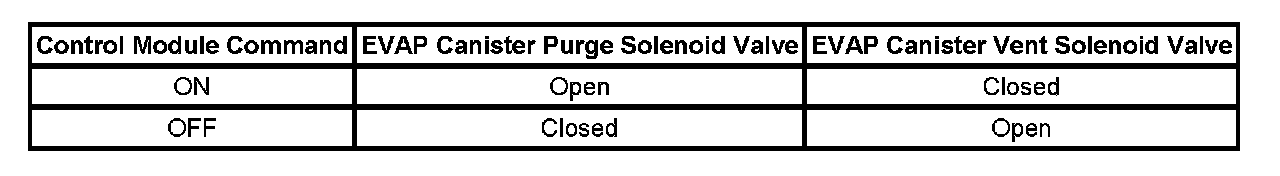 The table illustrates the relationship between the ON and OFF states, and the Open or Closed states of the EVAP canister purge and vent solenoid valves.