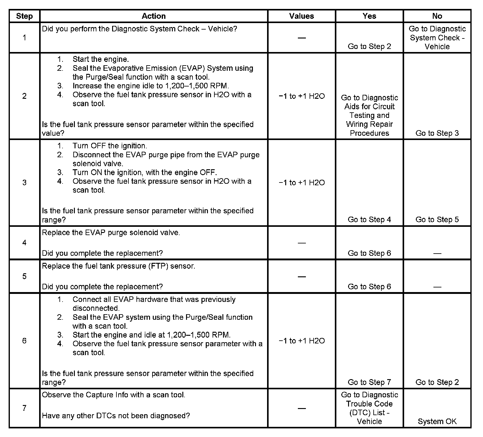 This DTC tests for undesired intake manifold vacuum flow to the Evaporative Emission (EVAP) System. The control module seals the EVAP system by commanding the EVAP canister purge solenoid valve Closed and the EVAP canister vent solenoid valve Closed. The control module monitors the fuel tank pressure (FTP) sensor to determine if a vacuum is being drawn on the EVAP system. If vacuum in the EVAP system is more than a predetermined value within a predetermined time, this DTC sets.