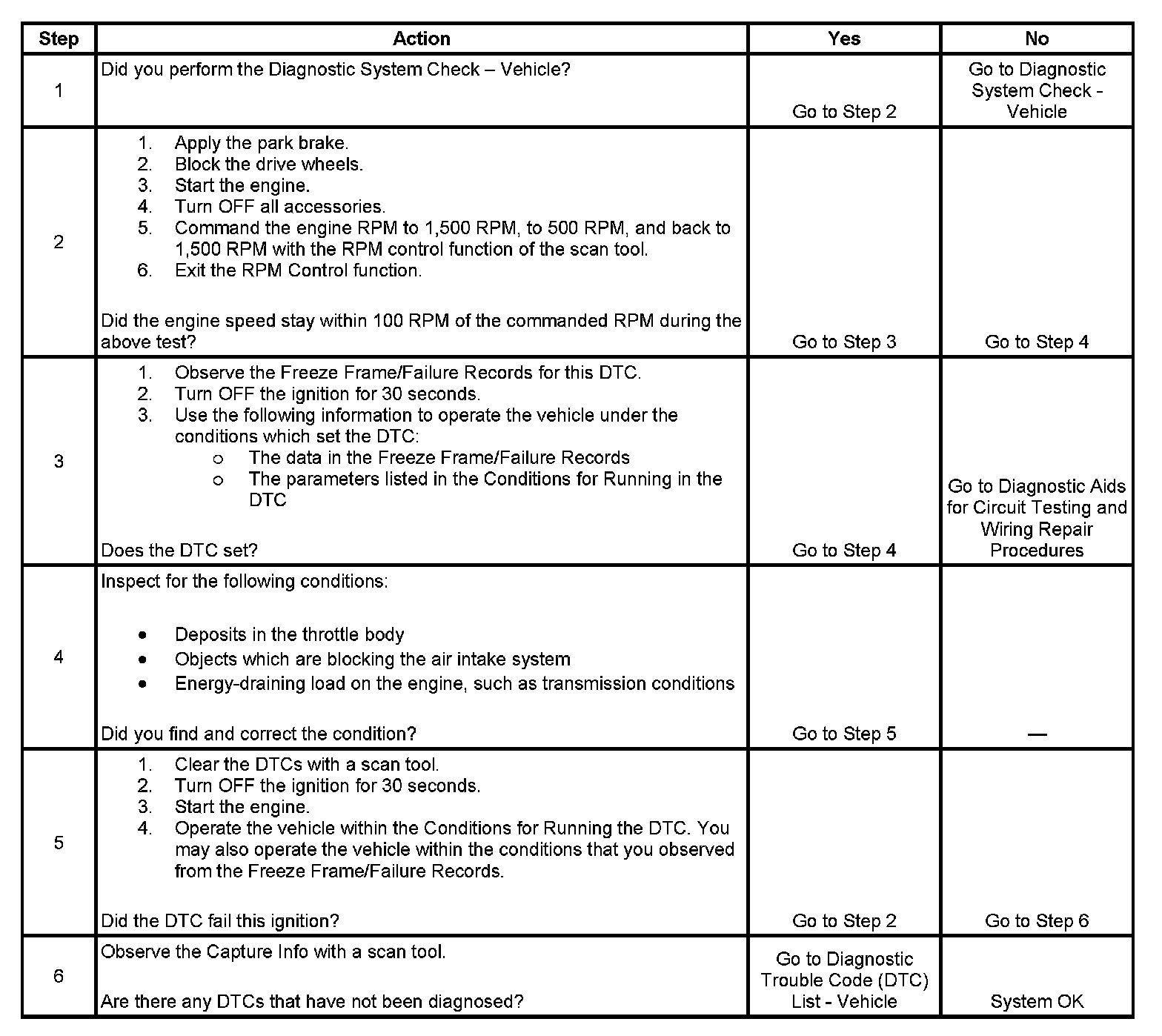 The Electronic Throttle Control (ETC) System uses various inputs from the powertrain control module (PCM). This system uses the inputs to control the idle speed through serial data circuits to the throttle actuator control (TAC) module. The DC motor, which is located on the throttle body, activates the throttle plate. In order to decrease idle speed, the TAC module commands the throttle closed, reducing air flow into the engine, and the idle speed decreases. In order to increase the idle speed, the TAC module commands the throttle plate open, allowing more air in order to bypass the throttle plate. If the actual idle RPM does not match the desired idle RPM within a calibrated time, DTC P0506 sets.