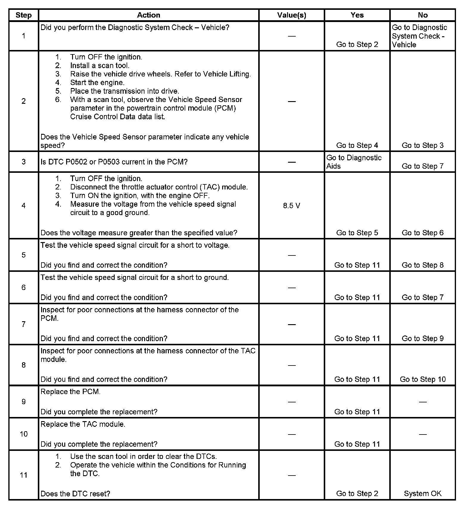 The powertrain control module (PCM) creates the vehicle speed signal by pulsing the signal circuit to ground. The PCM pulses the circuit at the same rate as the vehicle speed signal input. The PCM monitors the voltage on the vehicle speed signal circuit. If the PCM determines the voltage is out of the normal operating range, a DTC sets.