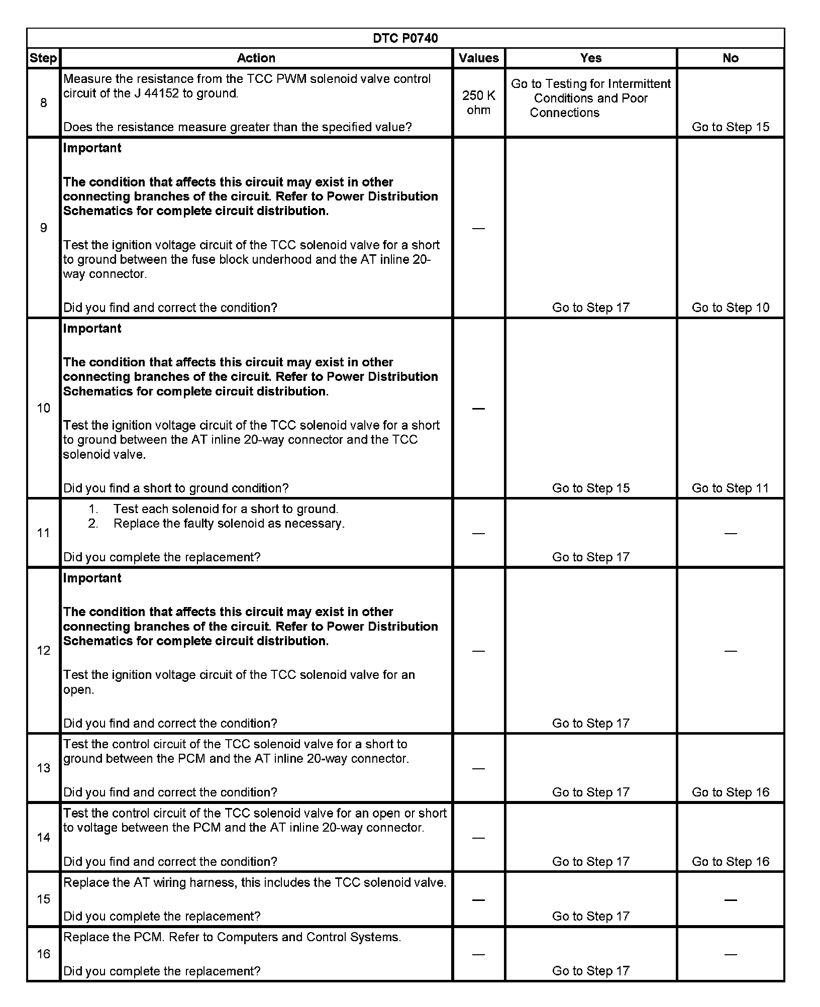 7. This step tests the resistance of the TCC solenoid valve and the automatic transmission (AT) wiring harness.