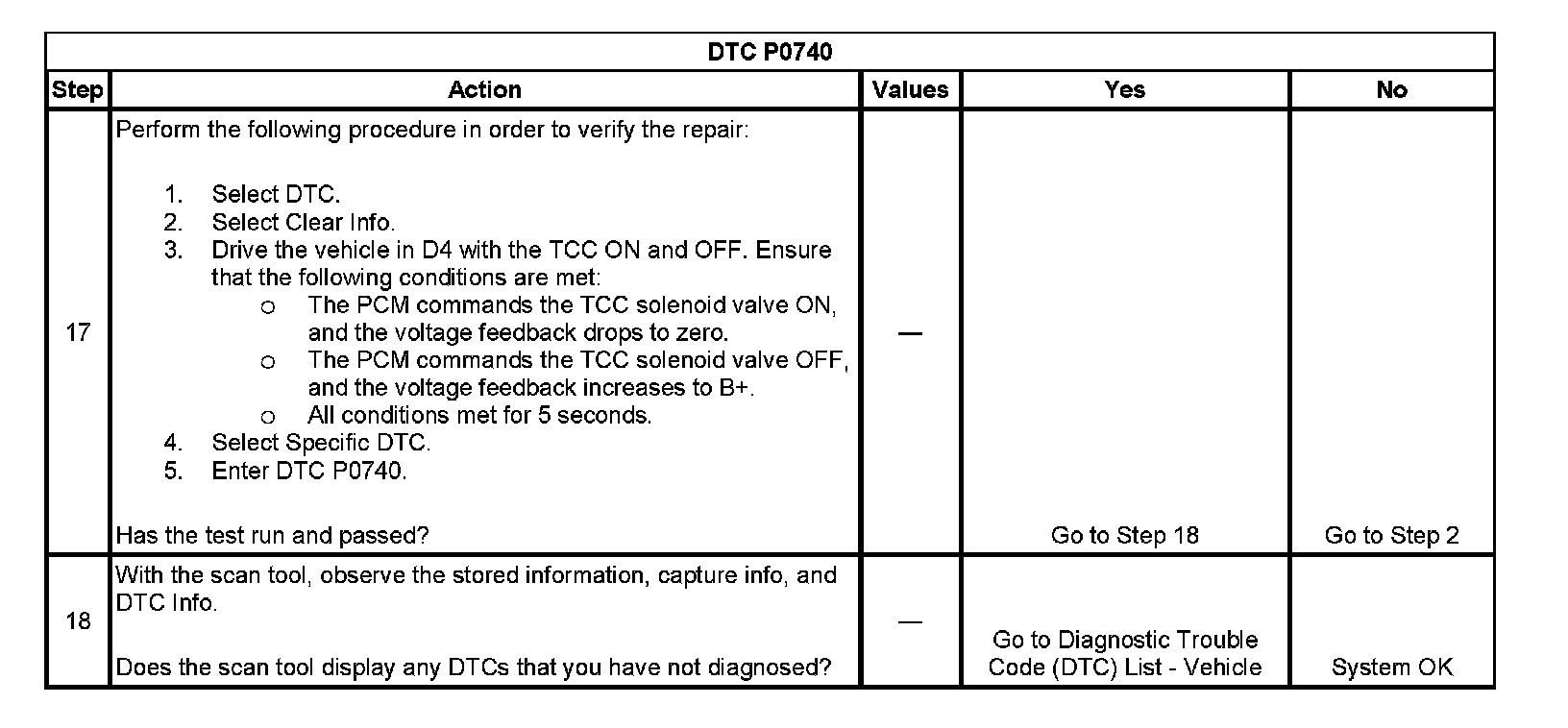 ^ The PCM stores DTC P0740 in PCM history during the second consecutive trip in which the Conditions for Setting the DTC are met.