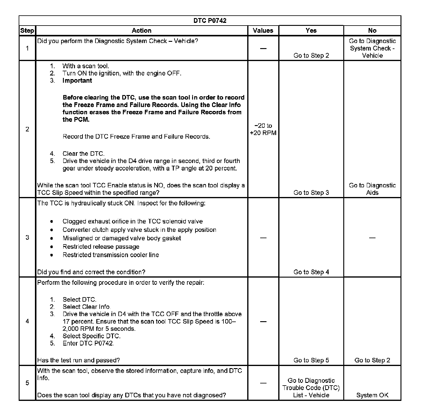 When the PCM detects low TCC slip speed when the TCC is commanded OFF, then DTC P0742 sets. DTC P0742 is a type B DTC.