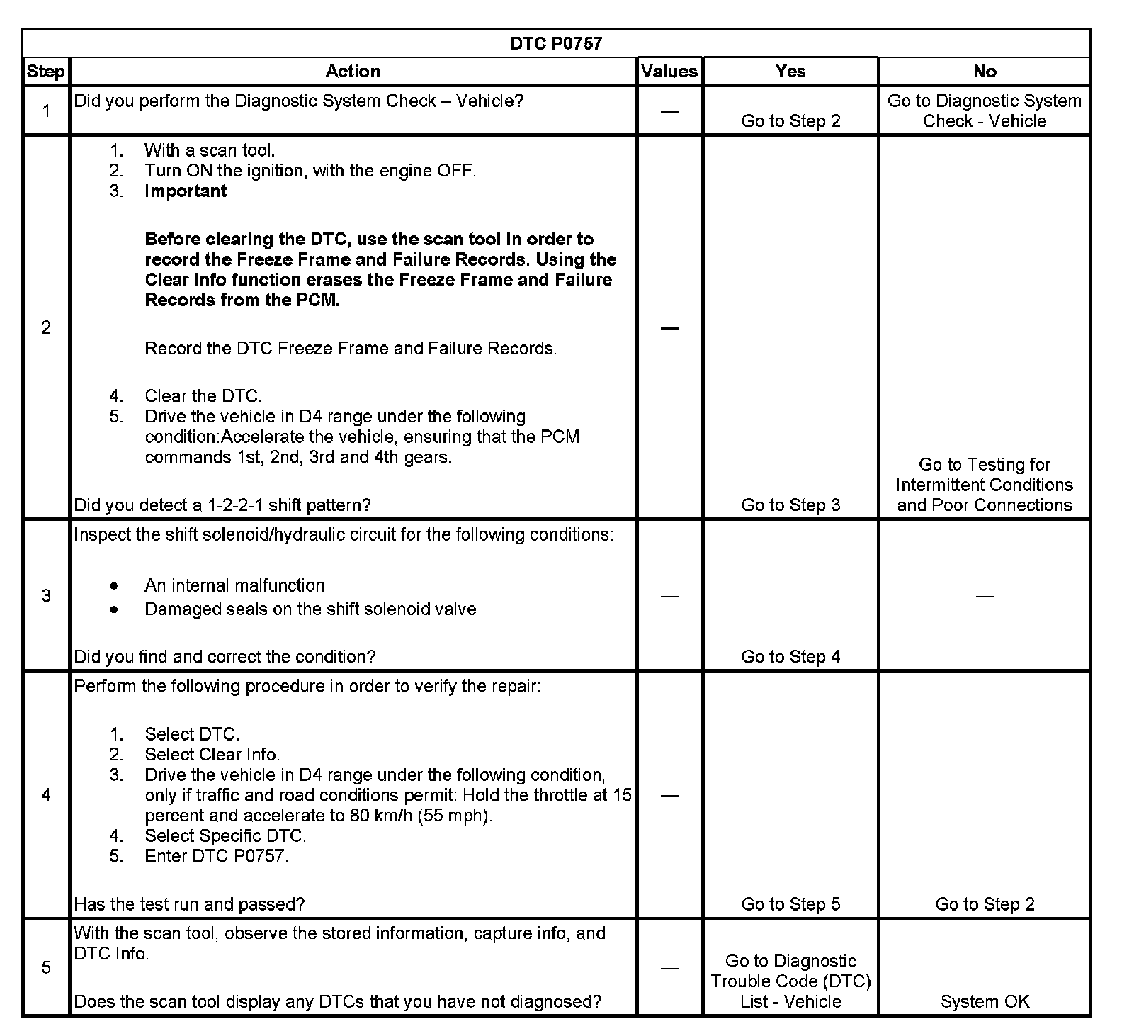 When the powertrain control module (PCM) detects a 1-2-2-1 shift pattern, then DTC P0757 sets. DTC P0757 is a type A DTC.