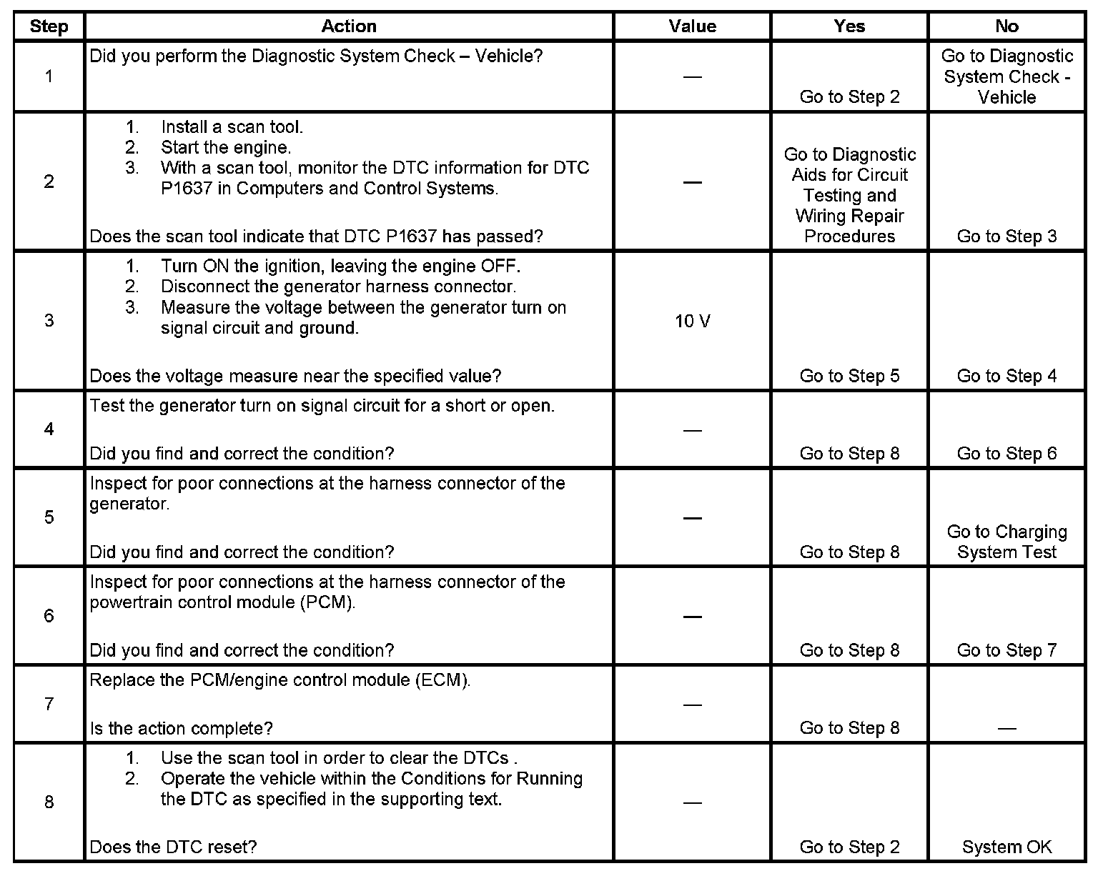 The powertrain control module (PCM) uses the generator turn on signal circuit to control the generator. A high side driver within the PCM allows the PCM to turn the generator ON and OFF. When generator operation is desired, the PCM sends a 5-volt signal to the voltage regulator via the generator turn on signal circuit. This causes the voltage regulator to begin controlling the generator field circuit. Once the generator is enabled by the PCM, the voltage regulator controls generator output independently of the PCM. Under certain operating conditions, the PCM can turn Off the generator by turning OFF the 10-volt signal on the generator turn on signal circuit. The PCM has fault detection circuitry which monitors the state of the generator turn on signal circuit. If the fault detection circuit senses a voltage other than what is expected, this DTC will set. The voltage regulator also contains fault detection circuitry. If the regulator detects a problem, the regulator will ground the generator turn on signal circuit, pulling the voltage low. This also causes the PCM to set the DTC.