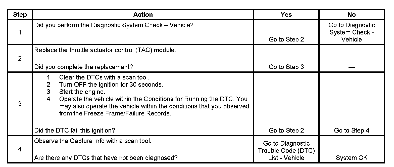 The throttle actuator control (TAC) module contains data which is essential for proper TAC system operation. The TAC module continuously tests the integrity of this data. When the TAC module is unable to write or read data to and from random access memory (RAM), or the TAC module is unable to correctly read data from the flash memory or an internal TAC module processor fault is detected, this DTC sets.