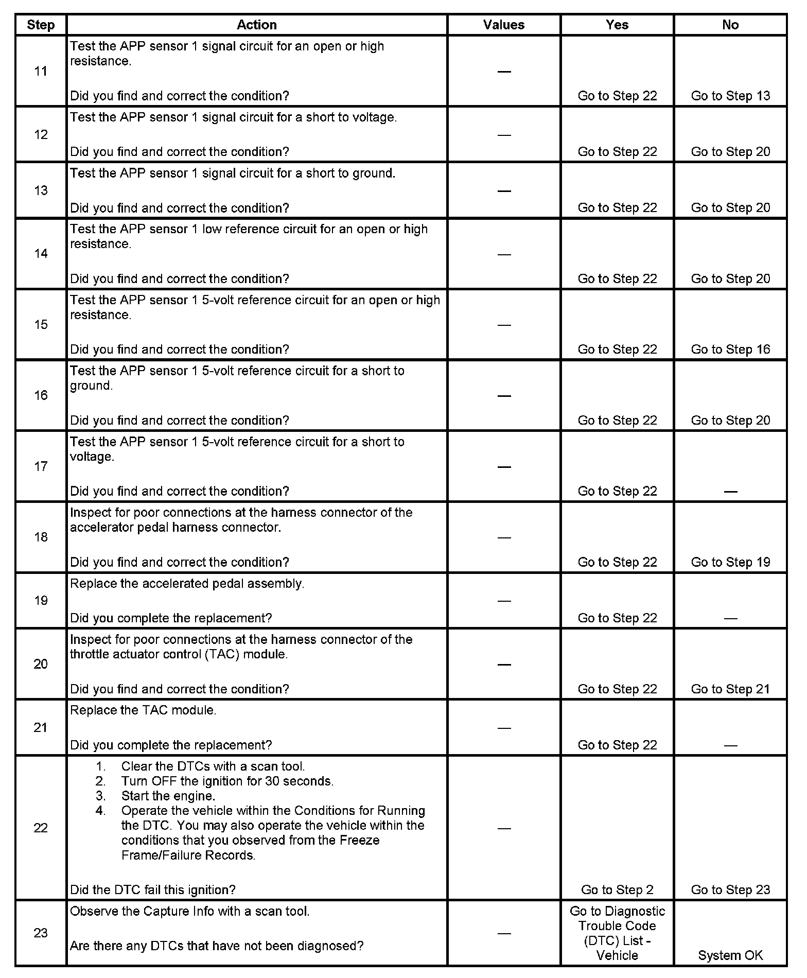 - The PCM detects that the APP sensor 1 signal voltage is less than 0.24 volts or more than 4.49 volts. OR
