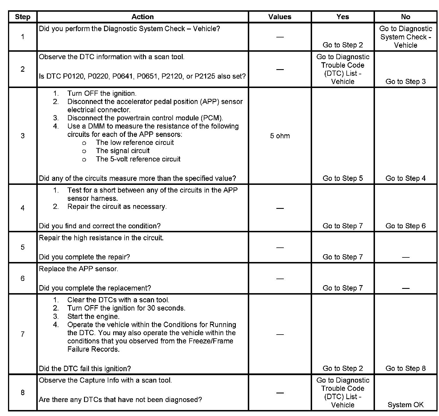 2. Any circuit faults on either APP sensor 1 or 2 will set one of the DTCs listed. Refer to the appropriate table for diagnosis.