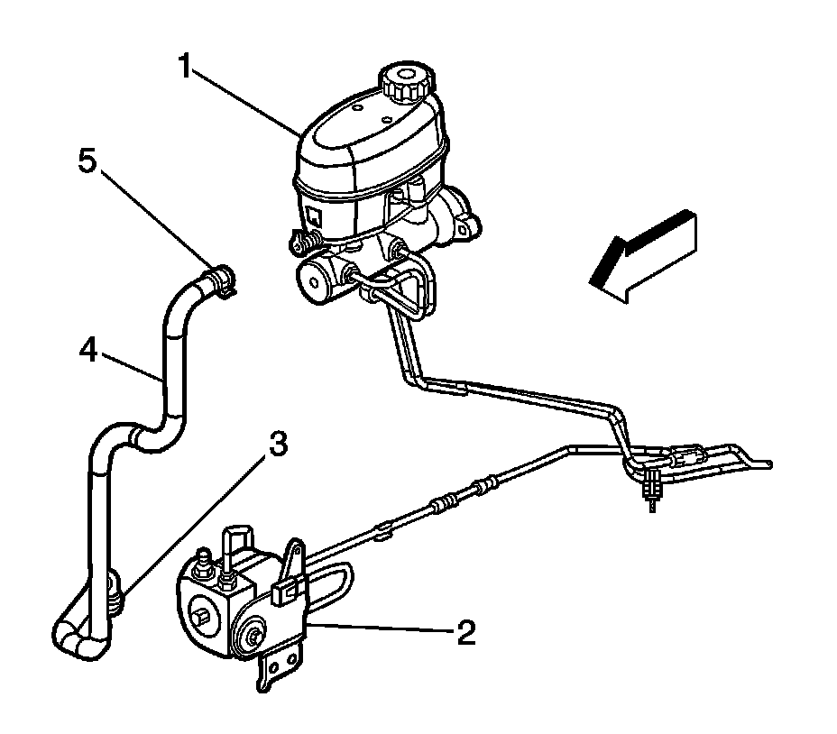 5. For vehicles with JL4, remove the plug from the reservoir port and install the hose (4) and clamp (5) to the reservoir.
