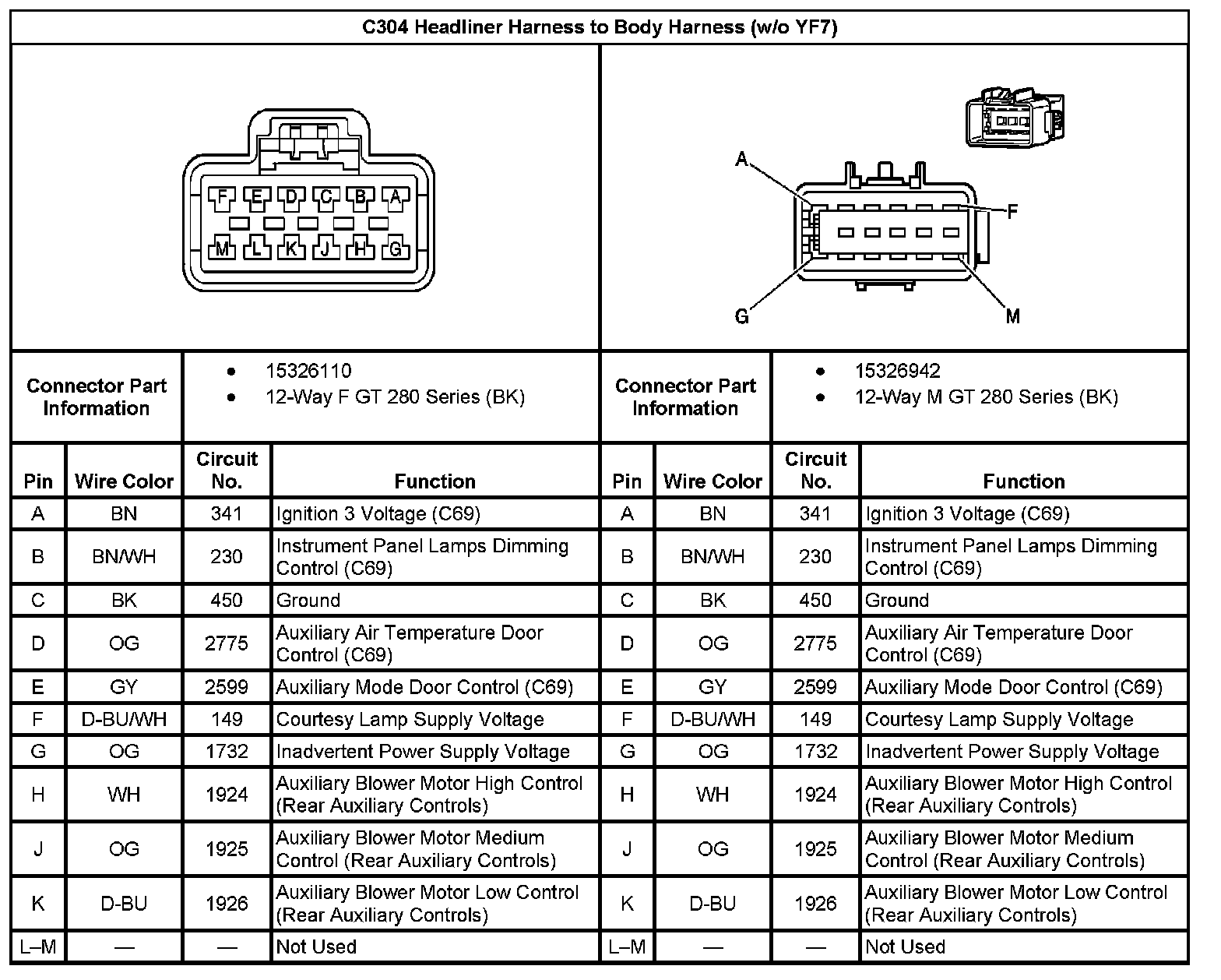 C304 Headliner Harness to Body Harness (Without RPO Code YF7):