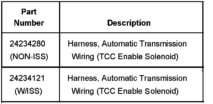 Remove the TCC Enable solenoid / automatic transmission wiring harness. Refer to Torque Converter Clutch Pulse Width Modulation (TCC PWM) Solenoid, TCC Solenoid, and Wiring Harness in the appropriate SI Document.