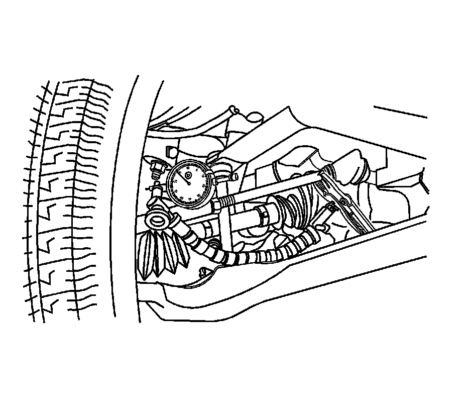 7. Install the dial indicator between the pitman arm and relay rod as shown in and push inward on the tire to remove the lash slowly with one hand.