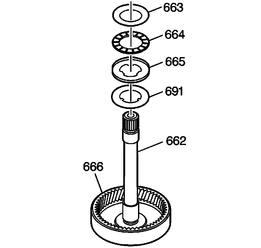 4. Install the sun gear rear thrust bearing assembly (664) and bearing races (663, 665) onto the main shaft (662).